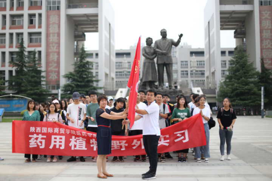 最后,由太阳成集团tyc234cc主页教学副院长王飞娟授予中药学教研室主任王琪野外实习旗帜,王老师接过旗帜,带着大家一起宣誓,保证带领我们的团队安全出去,平安归来。