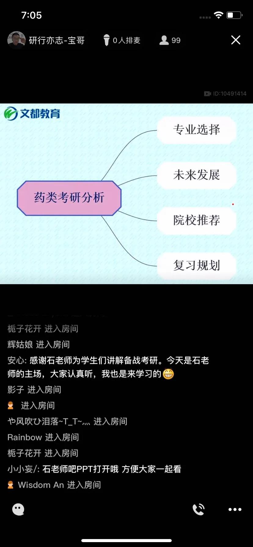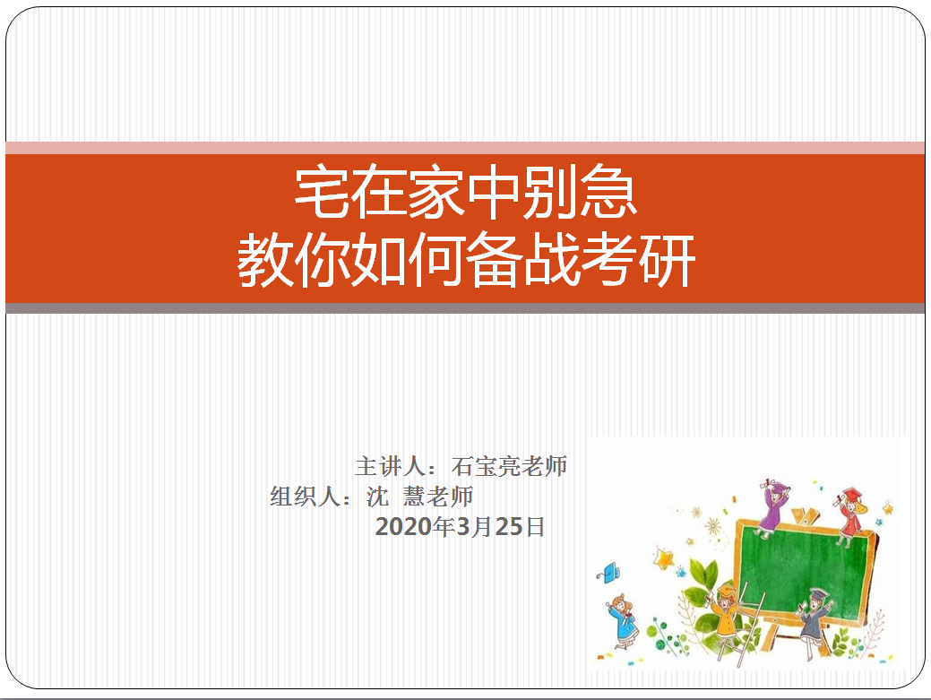 今年的庚子鼠年注定是不平凡的一年,“疫情防控战”成为了全国人民的核心议题,是关系到每个人的生命之战。受疫情影响,全国各大高校陆续发出延迟开学的通知。同学们不能像在学校那样泡在图书馆或自习室等地方学习,只能宅在家中学习。尽管如此,时间不会因此而停止或变慢,作为即将大四的同学们,备战考研已经刻不容缓。为了进一步加强2021届考研的针对性,增加同学们的考研信心,3月25日下午7点,太阳成集团tyc234cc主页B2017级药学、中药学考研专题宣讲会顺利召开。本次宣讲会由文都教育石宝亮老师主讲,辅导员沈慧老师组织,学生科副科长田俊武和有考研意向的同学共同参加了本次会议。