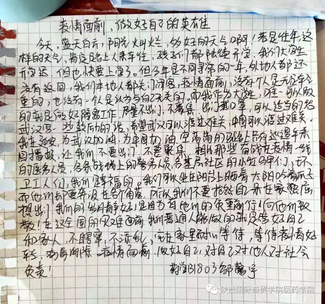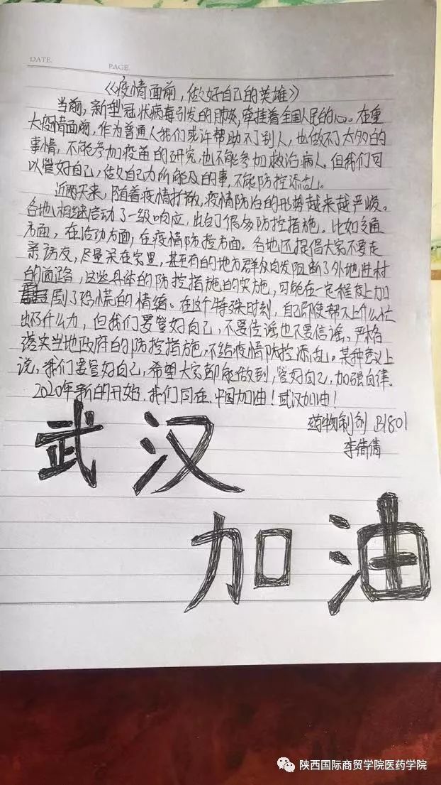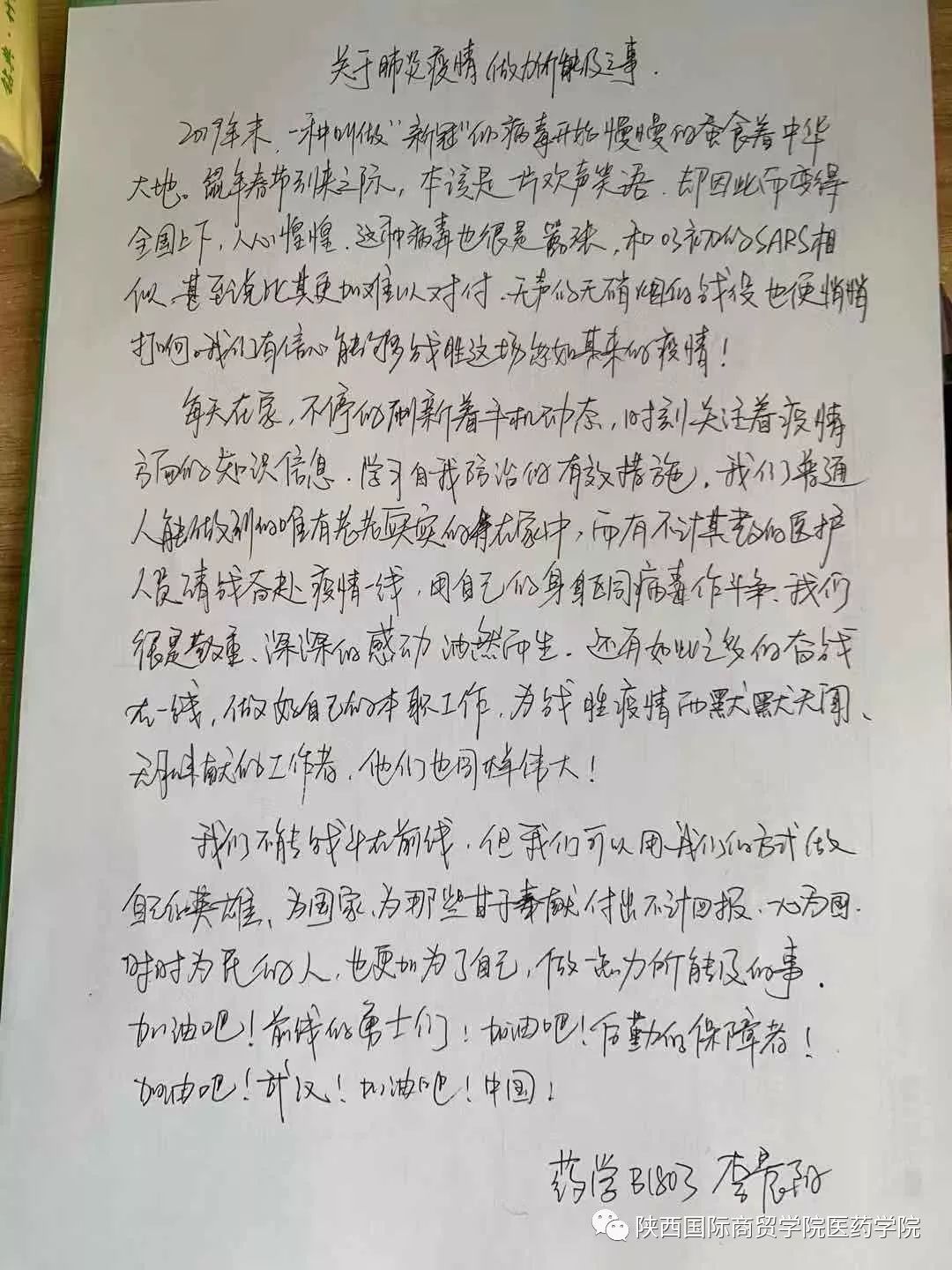 同时,18级本科学生通过手写祝福的方式为祖国和武汉送上最真挚的问候和祝福,有道是灾难无情人有情,由衷地希望山河无恙国泰民安。