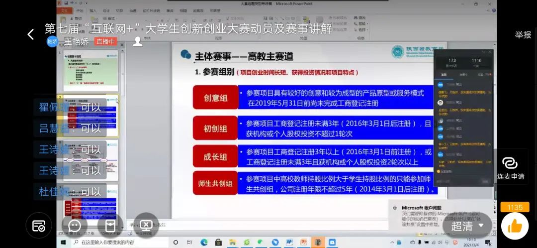 3月4日,创新创业与校企合作教研室主任韩小娟、王艳娇、李晓花三位老师利用钉钉平台直播,为学生详细讲解了比赛的内容和细则,并分享关于“互联网+”的参赛经验,针对学生提出的问题进行解答;同时给同学们提出了四点期望和要求:一要确定目标,激发赛欲;二要组建团队,充分协作;三要把握机会,积极行动;四要遵守赛规,踊跃申报。