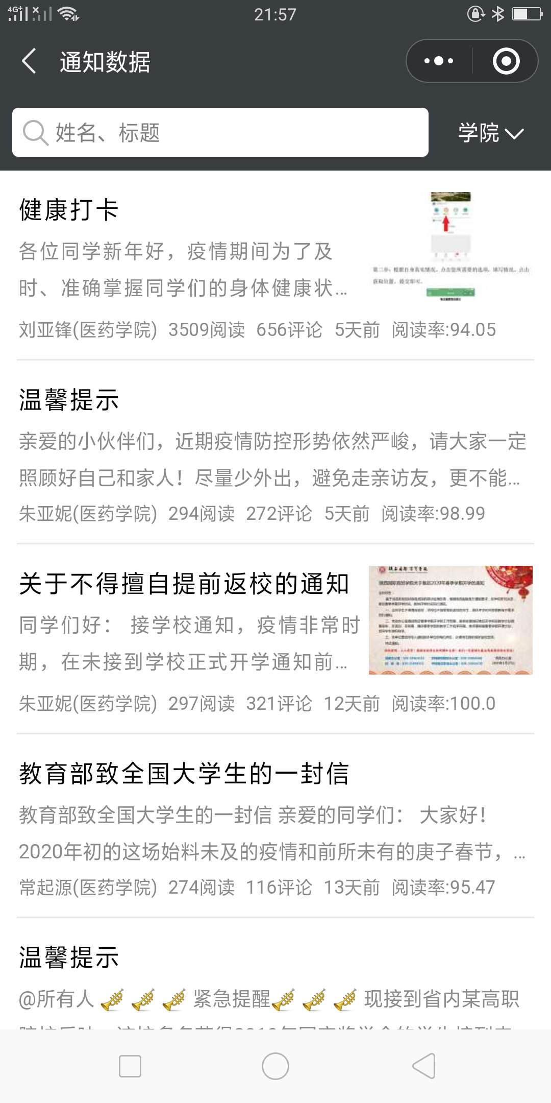 自疫情防控以来,学院辅导员以电话、微信、QQ等多种形式对每位学生所在位置、身体状况、疫情防护、有无接触等方面进行登记造册,全面摸排学生信息,尤其对湖北籍和滞留湖北的学生重点排查,做到不落一人,随时跟踪学生行程。同时,利用信息化平台实行学生健康排查,对全体学生实行每天在”我在校园”健康打卡,并对显示异常学生及时跟踪、了解并认真做好工作台账,掌握学生疫情期间身体健康状况。