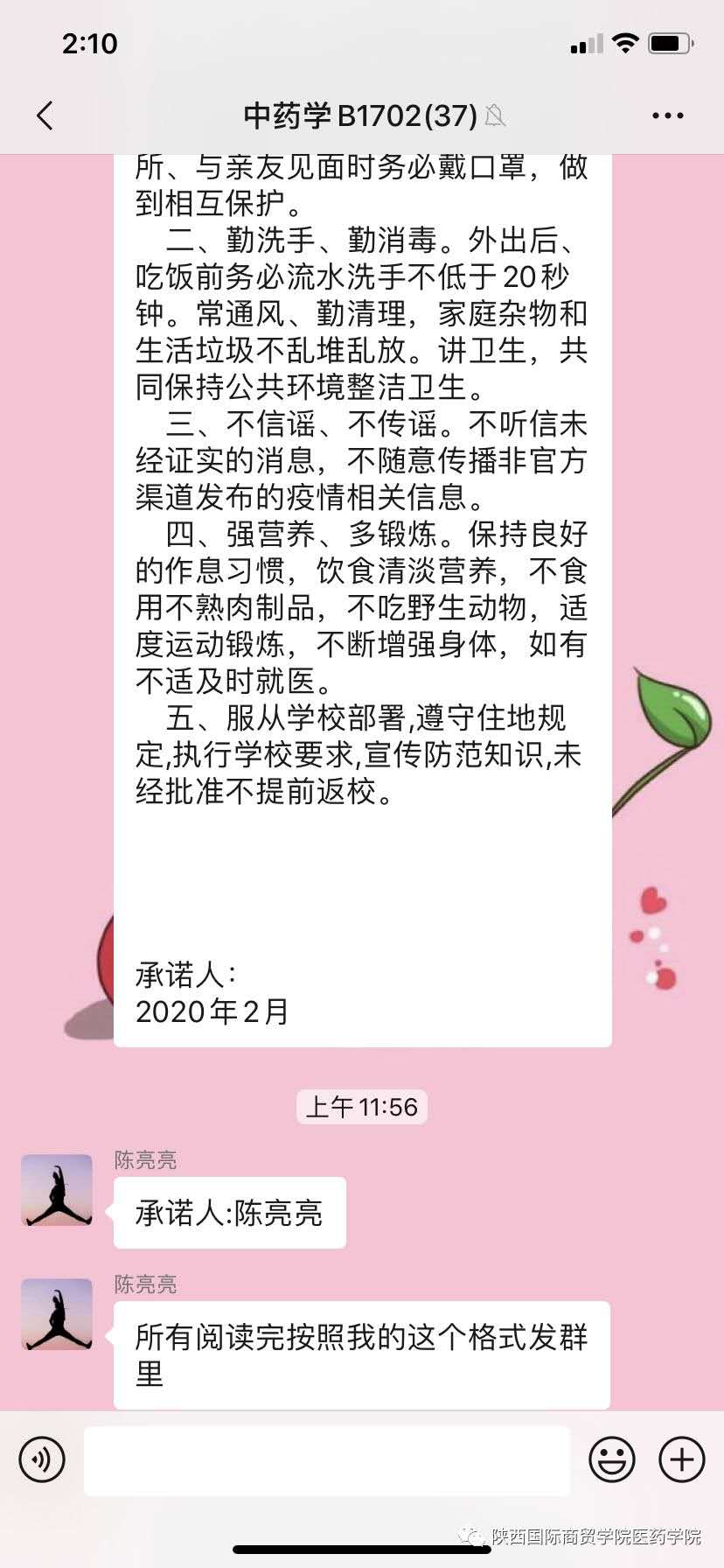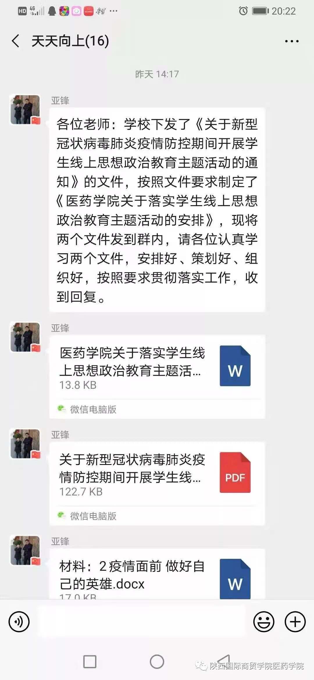 充分发挥网络思想政治教育阵地优势,按照要求制定了《太阳成集团tyc234cc主页关于落实学生线上思想政治教育主题活动的安排》,2月10、11日分别召开辅导员和学生党员安排部署会,通过多种形式有序开展线上思想政治教育活动,落实中省和学校有关疫情防控会议精神,学习董事长《疫情面前,做好自己的英雄》并撰写心得体会,观看《疫情下的心理防护》专题讲座,提升学生自我防范意识,增强学生战胜疫情的信心,疏解学生心理压力,培养学生健康的人生观和价值观。