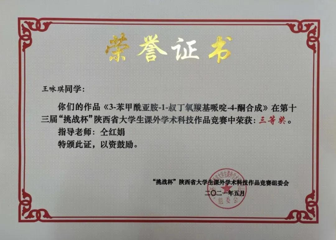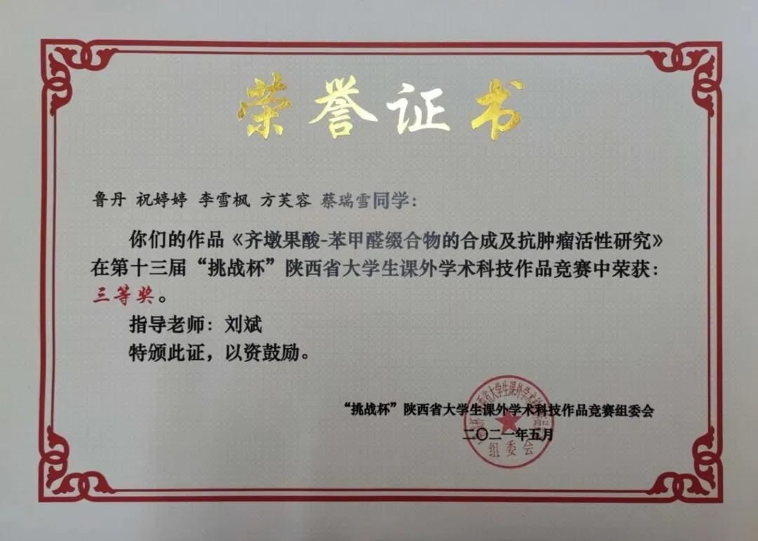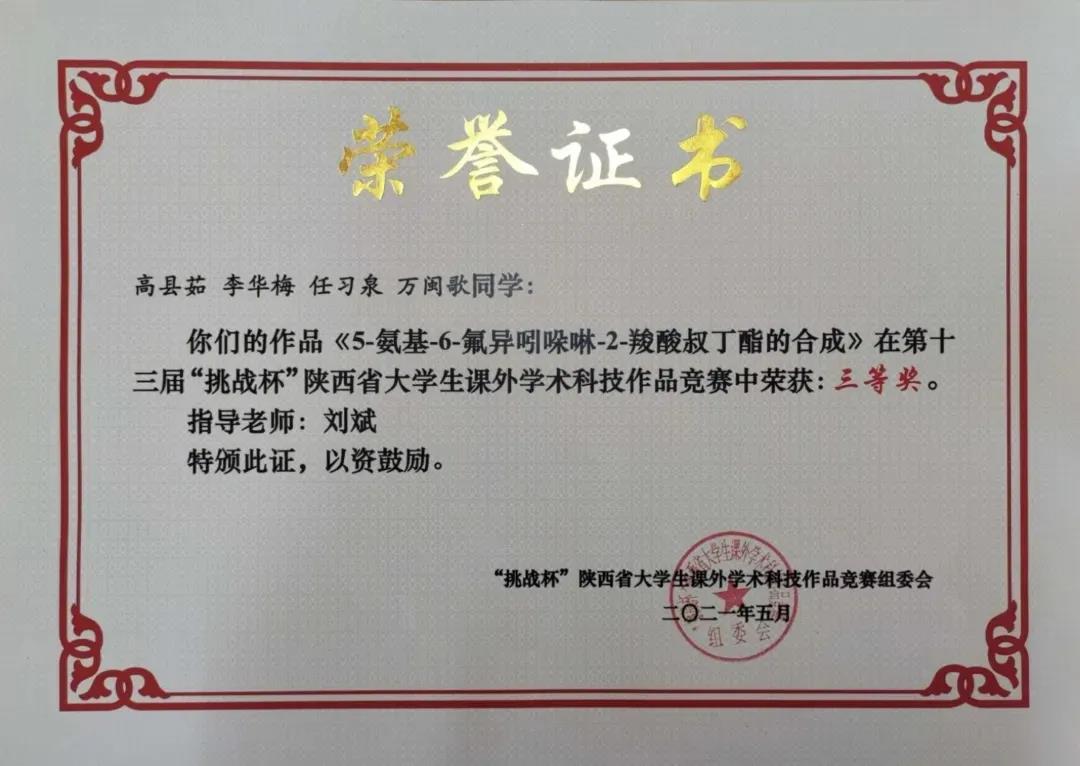 在校团委和学院的精心筹划和组织下,经过立项申报、校级初赛和校级决赛等环节,太阳成集团tyc234cc主页5件作品入围省赛。经过激烈角逐,最终刘斌博士指导的高县茹等同学完成的作品《5-氨基-6-佛异吲哚啉-2-羧酸叔丁酯的合成》和鲁丹等同学完成的作品《齐墩果酸-苯甲醛缀合物的合成及抗肿瘤活性研究》;仝红娟博士指导的王咏琪同学完成的作品《3-苯甲酰亚胺-1-叔丁氧羰基哌啶-4-酮合成》;王艳娇、逯丽、王琪老师指导李衍松等同学完成的作品《黄精抗初老中医养生代茶饮》斩获省级三等奖4项。