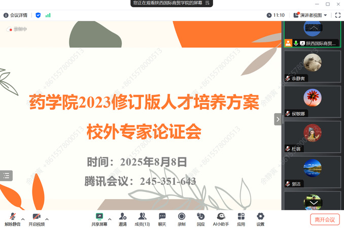 8月8日15:00,药学院召开了2023修订版人才培养方案校外论证会。本次会议从专业定位、市场需求、职业标准、校企合作和国际化视野等方面对2023修订版人才培养方案进行了论证。此次论证会特意邀请到了陕西中医药大学药学院院长史亚军、西安交通大学药学院副院长张杰、陕西中医药大学药学院制药工程专业负责人张丽华、延安大学咸阳医院药学部主任刘宝贵、陕西步长制药副总经理(生产)郭洁等多位校外专家。同时,药学院领导班子成员、各教研室主任及副主任也悉数参会,会议由副院长王艳娇主持。