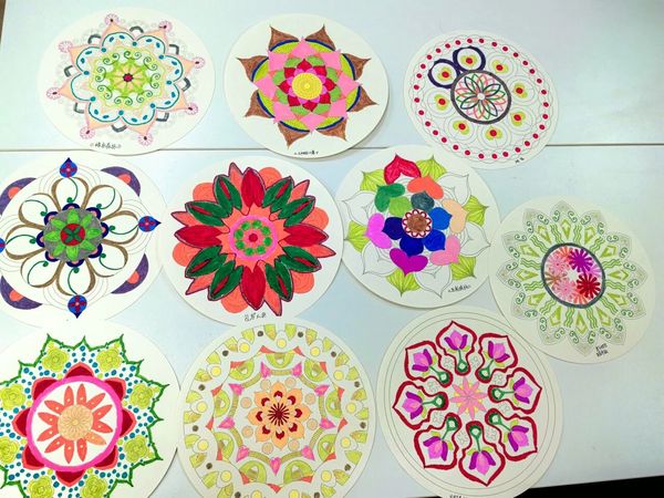 学生们围坐桌前,面对空白圆形画纸,从最初因阴雨产生的些许低落,到在画笔起落间逐渐明朗——有人以明黄线条构建如骄阳般的中心图案,有人用橙红与浅粉晕染出雨后初晴的渐变层次,还有人在边缘点缀出象征希望的几何纹样,仿佛要把对晴天的渴望都倾注在画纸上。